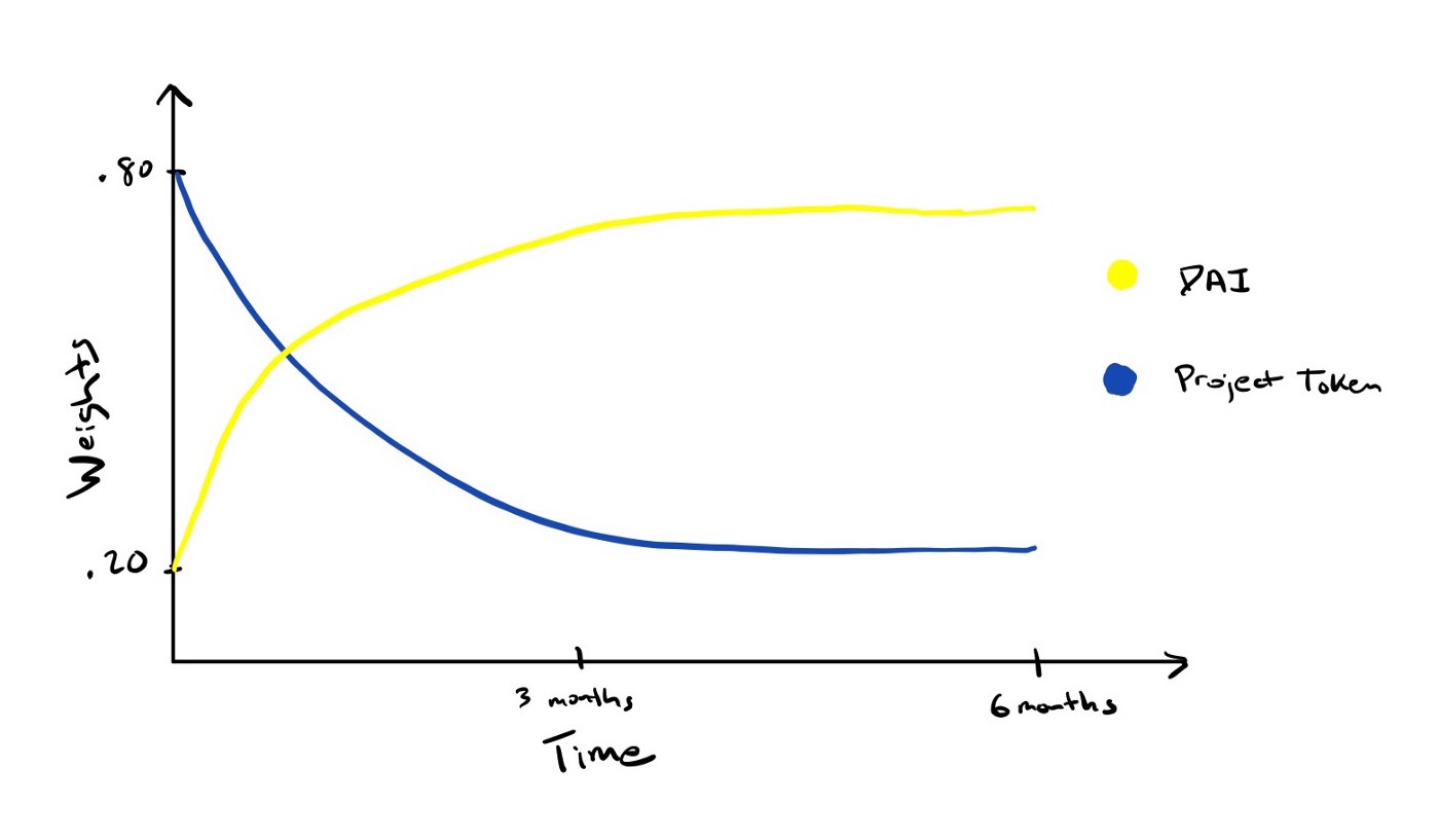 the smart pool template allows for vectors of tokens and weights. So one option would be to start 80% XYZ, 10% DAI, 10% ETH and end at 33% XYZ, 33% DAI, 33% ETH. Allowing for users to purchase the project token in ETH or DAI.