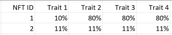 但按照 average trait,那么显然 NFT 2 更 rare。