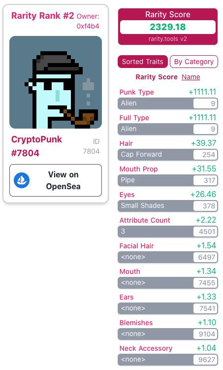 例如:Punk中只有9个 Alien,那么 Punk Type 这一项的 rarity score 就是 10,000 / 9 = 1111